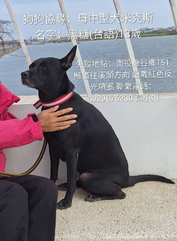 轉貼內容 狗狗失蹤協尋 名字:黑糖(台語)母 13歲嘴巴和腳掌有白毛,黑色中型犬,指甲較長,配戴紅色反光項圈 失蹤日期:11/3 下午2:49疑似從[南投鹿谷鄉151縣道]鱒龍餐廳往… https://twpetsearch.arlinks.net/2025/11/lugu-nantou.html