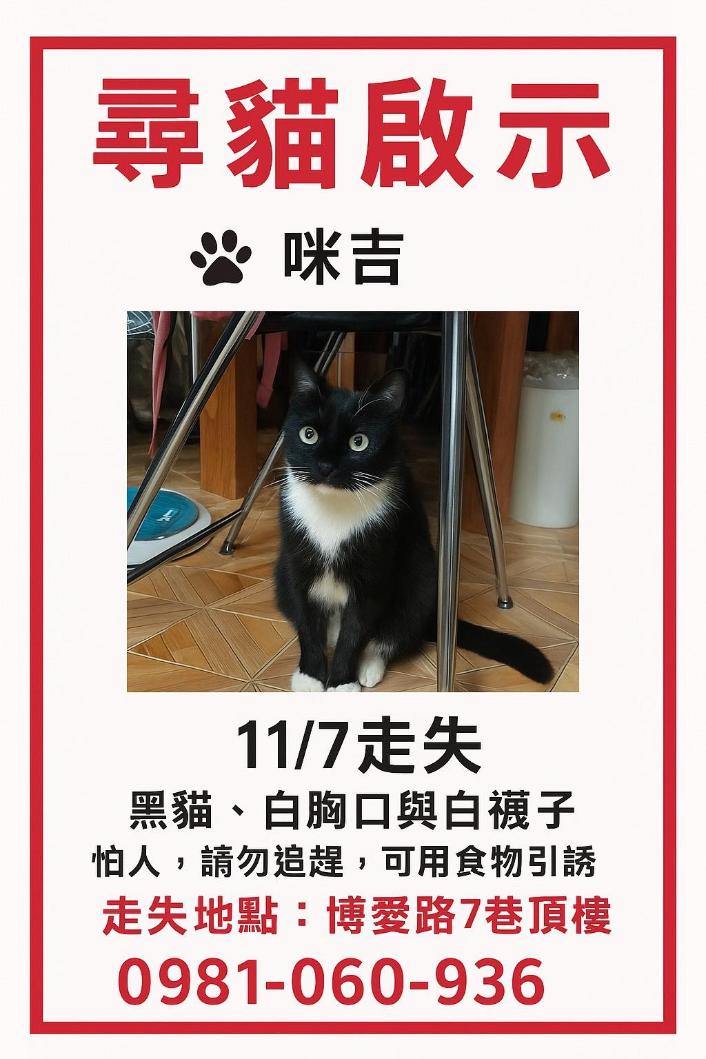 轉貼內容 ~貓咪協尋~ 走失時間:11/7(禮拜五)凌晨1、2點左右 走失地點:新北市新莊區博愛路復興路口 名字:咪吉(公)已結紮 個性:極度怕生,愛躲暗處 特徵:胸… https://twpetsearch.arlinks.net/2025/11/xinzhuang-new-taipei.html
