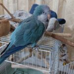 (藍色和尚鸚鵡、胸口灰白、腳上有綠色腳環)
