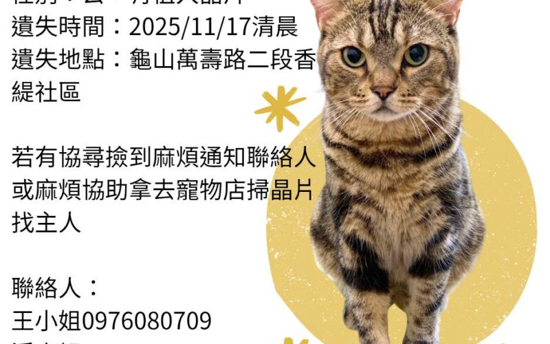 【尋找貓咪~錢錢 地點 桃園市龜山區】