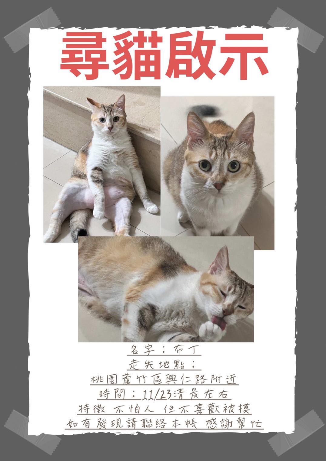 轉貼內容 尋貓啟事 朋友的貓咪走失了 名字 布丁 走失地點 桃園蘆竹區興仁路附近 時間11/23清晨左右 特徵 不怕人 但不喜歡被摸… https://twpetsearch.arlinks.net/2025/11/luzhu-taoyuan.html