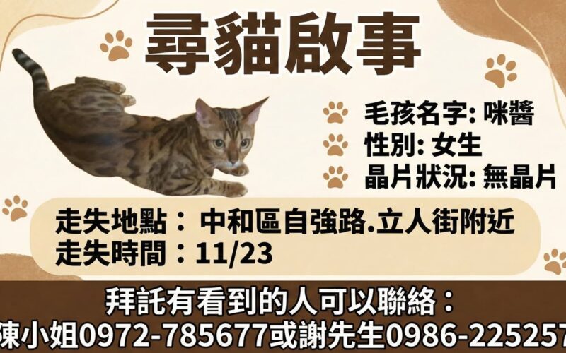 急尋…..新北中和自強路,走失時間大約11/23 下午四點後。家裡在5樓。走失路線待考察😮💨