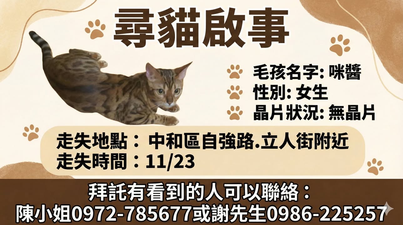 轉貼內容 急尋…..新北中和自強路,走失時間大約11/23 下午四點後。家裡在5樓。走失路線待考察😮💨 家裡已經很努力圍網子了,但是貓還是找不到,目前不見快1… https://twpetsearch.arlinks.net/2025/11/zhonghe-new-taipei_26.html