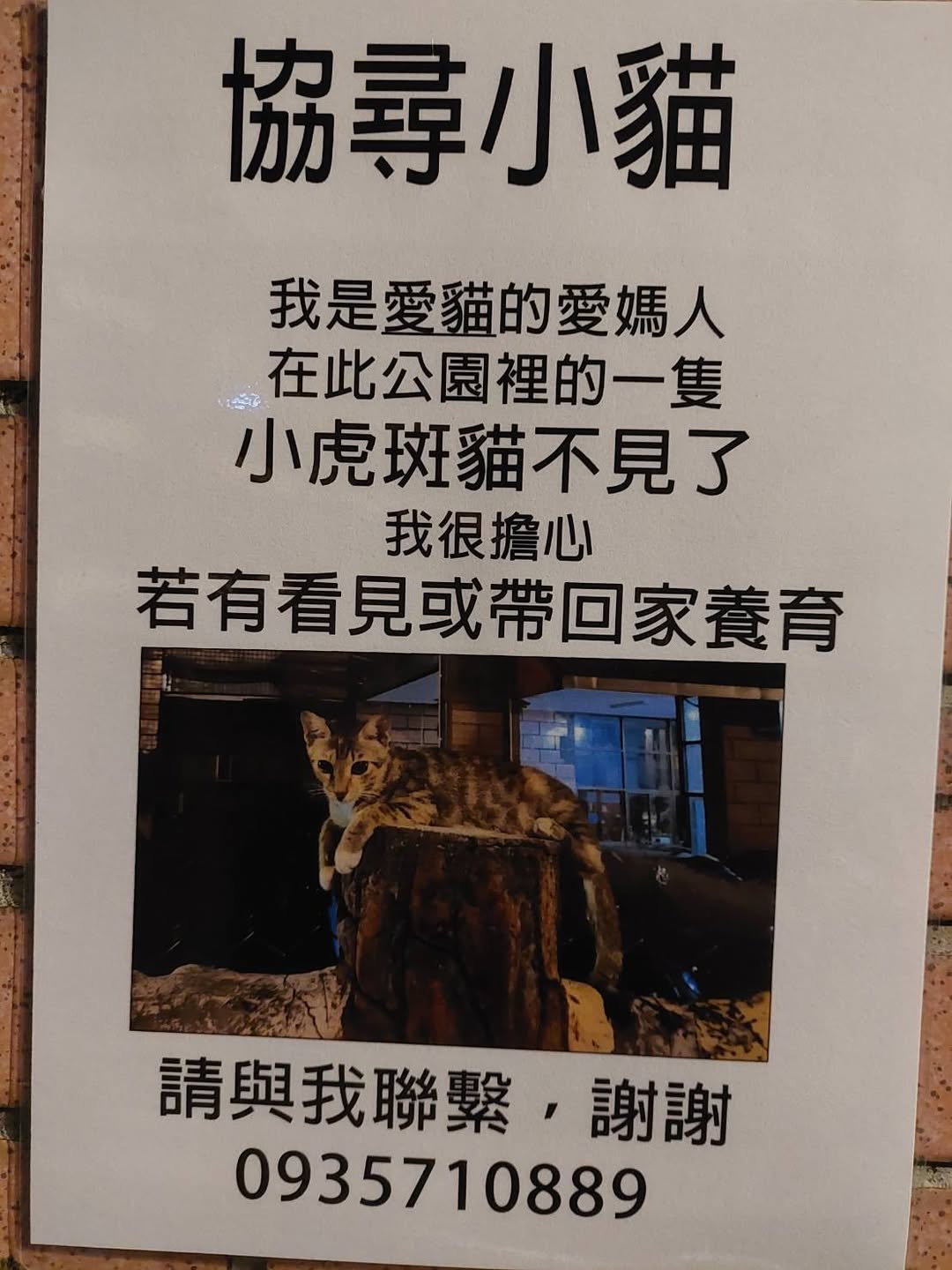 我是愛貓的愛媽 在此公園裡的一隻 小虎斑貓不見了 我很擔心 若有看見或帶回家養育