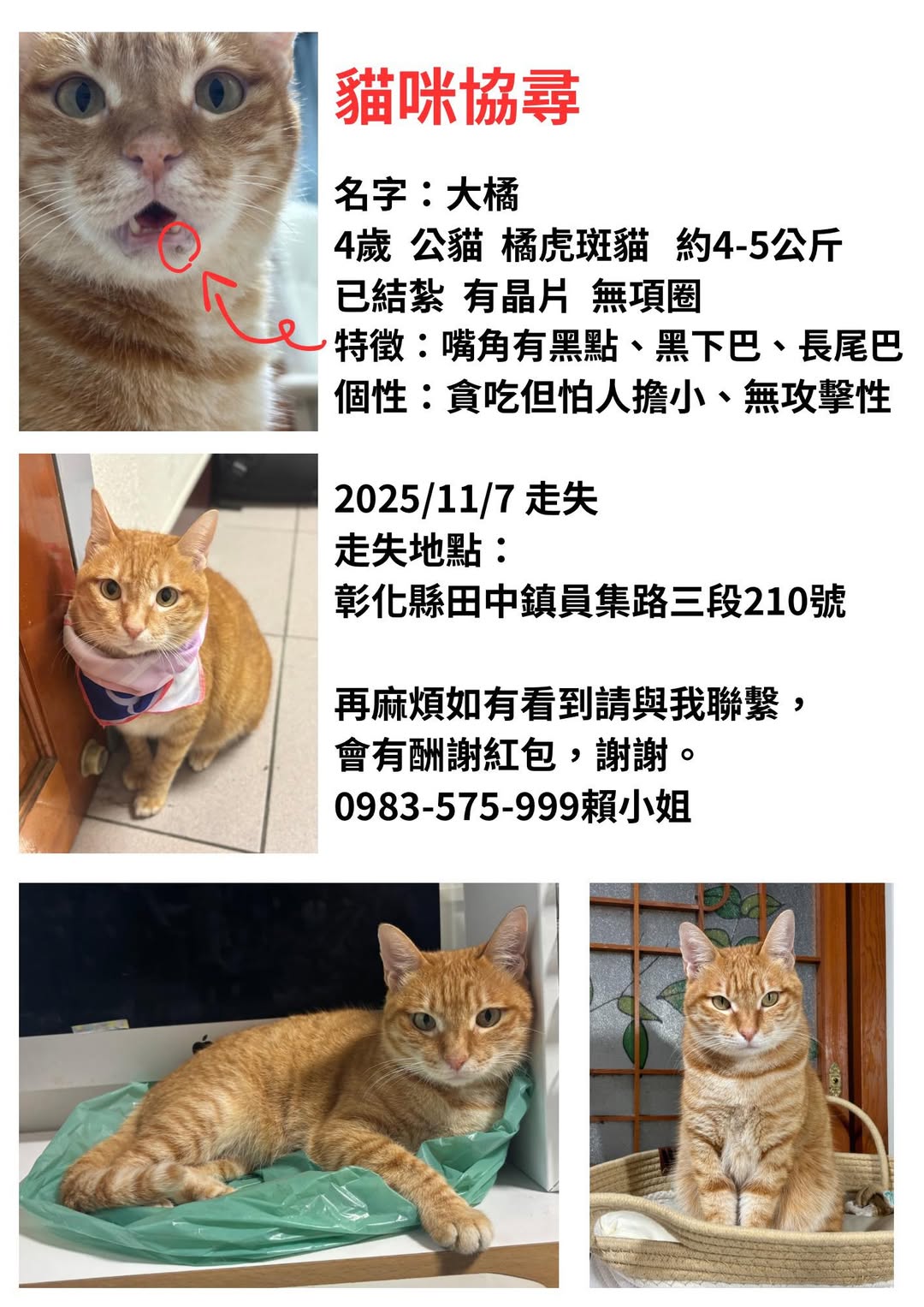 轉貼內容 貓咪協尋 時間:2025/11/7走失 地點:彰化縣田中鎮員集路三段210號 原因:出國家人未關好門跑走 名字:大橘 4歲,公貓,橘貓虎斑,長尾巴 約4-5公斤… https://twpetsearch.arlinks.net/2025/12/tianzhong-changhua.html
