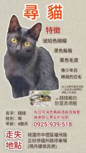【尋找貓咪~錢錢 地點 桃園市中壢區】