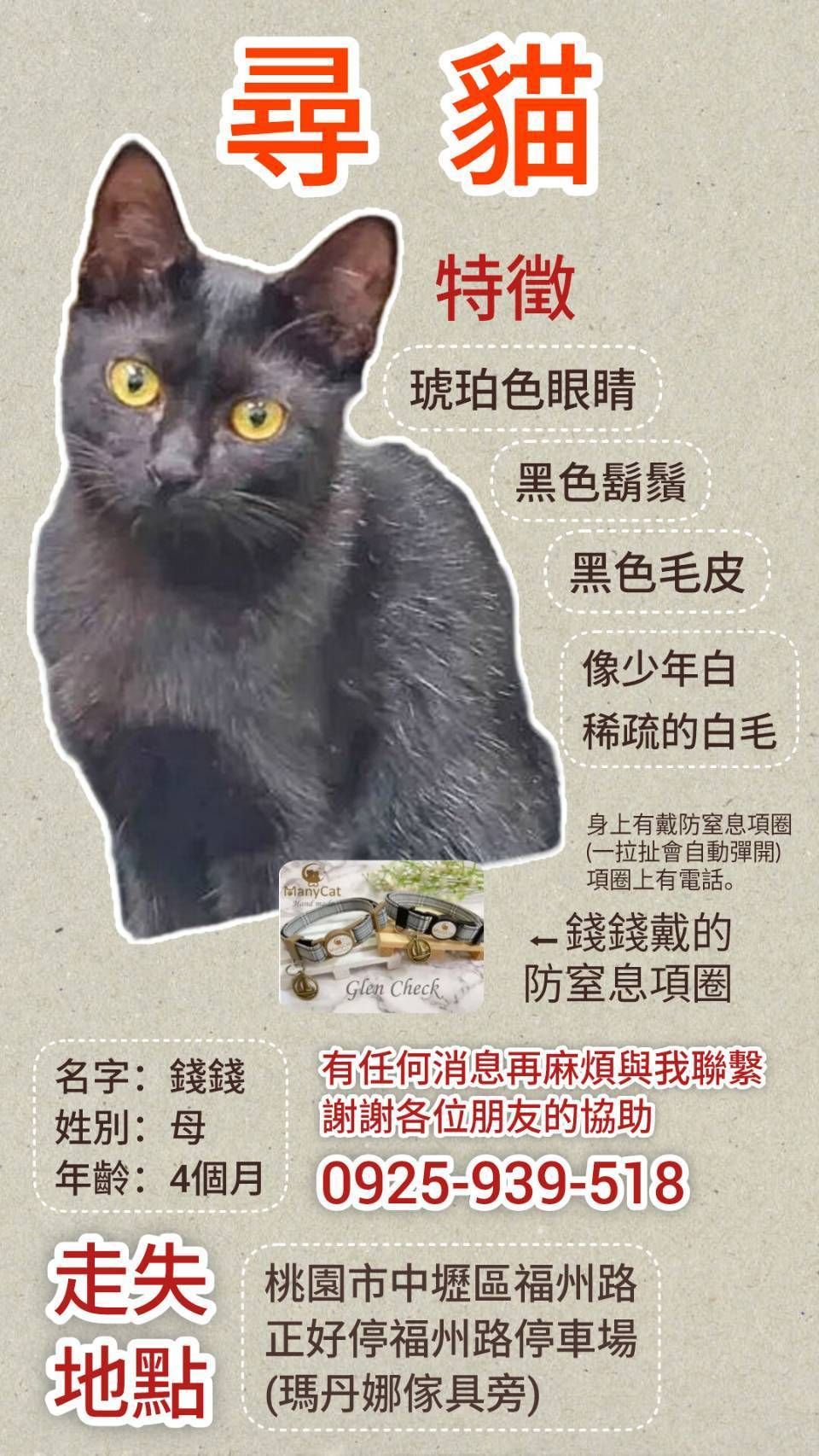 【尋找貓咪~錢錢 地點 桃園市中壢區】