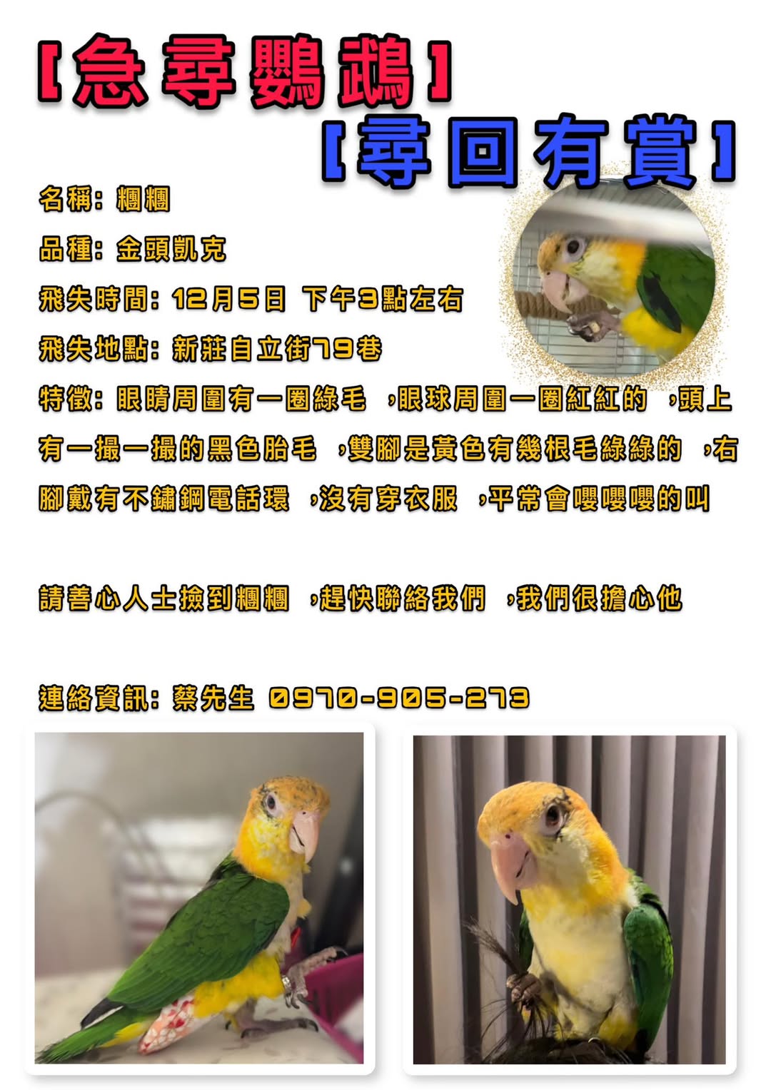 【尋找金頭凱克~佳架 地點 新北市新莊區】 轉貼內容 今天早上於新莊新樹路527巷飛失請各位幫忙協尋或轉發社團非常感謝 ...