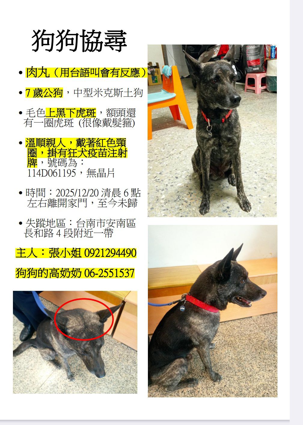 轉貼內容 為一個在路上尋找,走散毛小孩的家長代po文 肉丸(用台語叫會有反應) 7歲公狗,中型米克斯土狗 毛色上黑下虎斑,額頭還有一圈虎斑 (很像戴髮箍) 溫順親人,戴著紅色頸… https://twpetsearch.arlinks.net/2025/12/annan-tainan_26.html