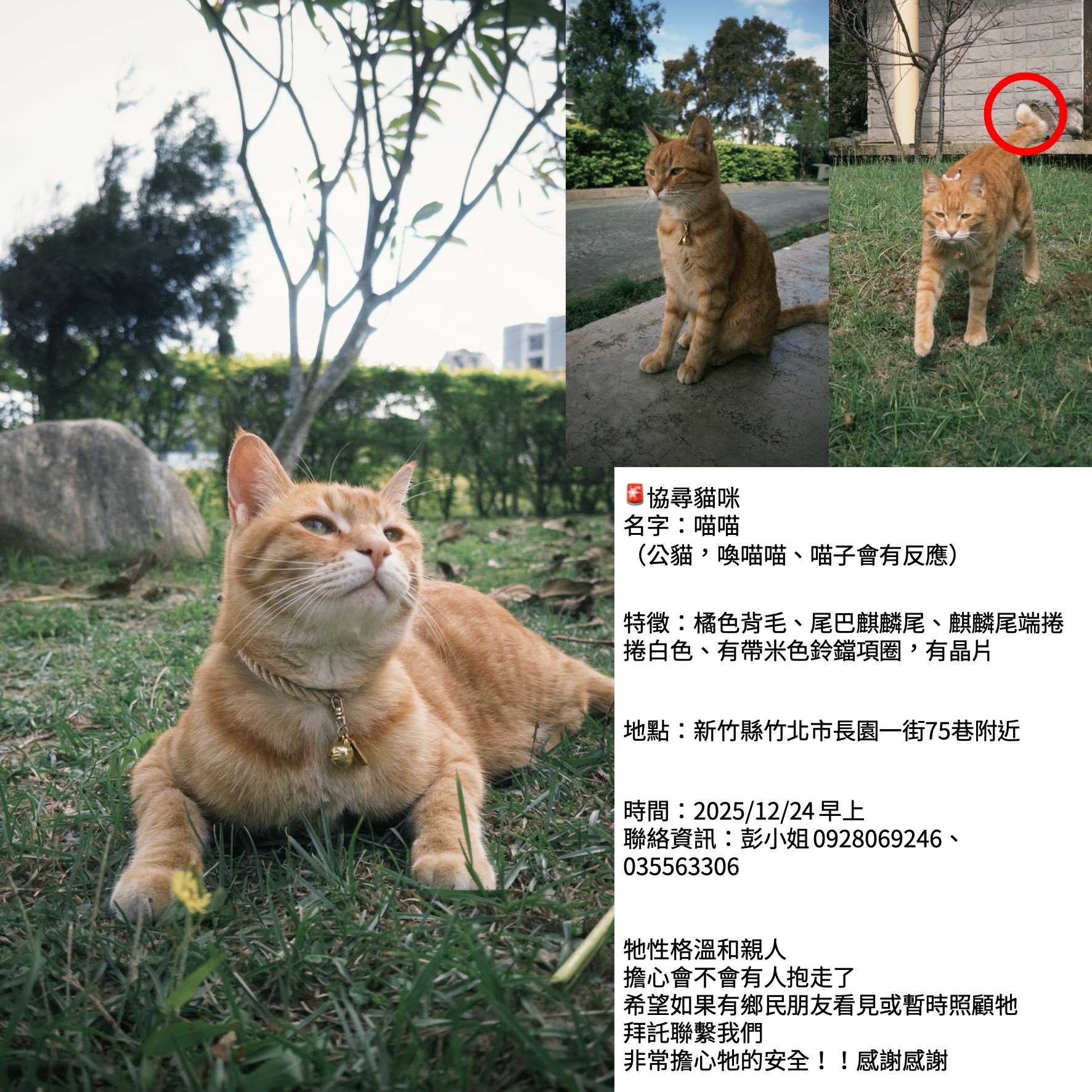 轉貼內容 🚨協尋貓咪 #橘貓 #麒麟尾 名字:喵喵 (公貓,喚喵喵、喵子會有反應) 特徵:橘色背毛、尾巴麒麟尾、麒麟尾端捲捲白色、有帶米色鈴鐺項圈,有晶片 地點:新竹縣竹北市長… https://twpetsearch.arlinks.net/2025/12/zhubei-hsinchu.html
