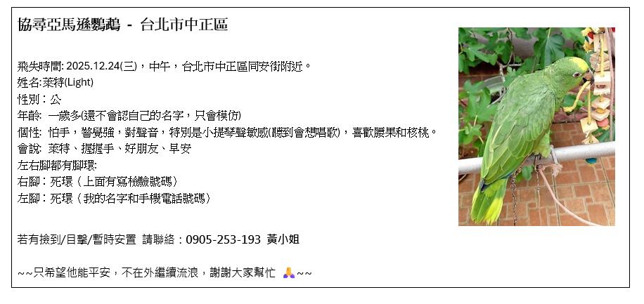 轉貼內容 懇請協尋亞馬遜鸚鵡,12/24在古亭捷運站附近飛失,請大家幫忙留意四周,感激不盡! https://twpetsearch.arlinks.net/2025/12/zhongzheng-taipei-amazon-parrot.html