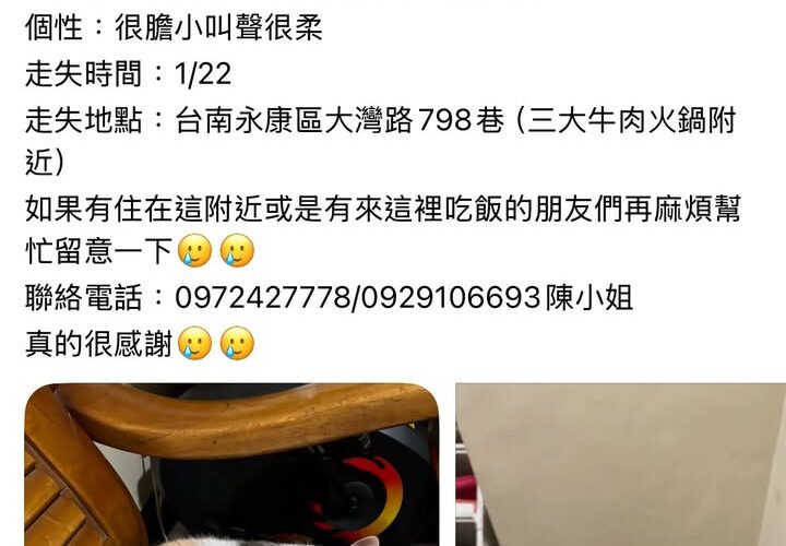 【尋找貓咪~麵麵 地點 台南市永康區】 轉貼內容