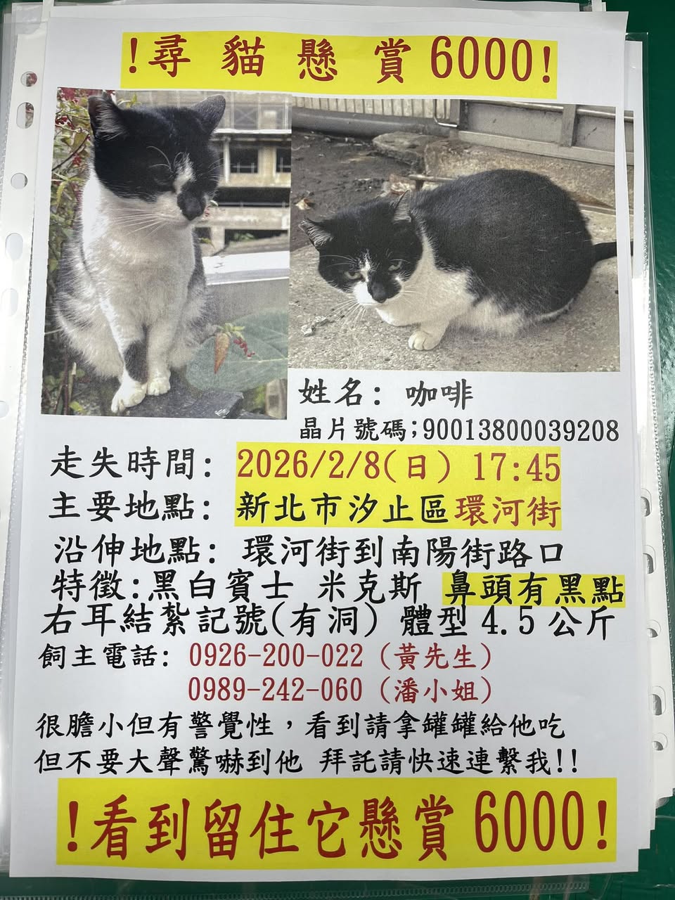 轉貼內容 !!尋貓懸賞 6000!! 時間 2026/2/8(日)晚上5:45分 走失地點 新北市 汐止區 環河街 可能延伸到環河街南陽街… https://twpetsearch.arlinks.net/2026/02/xizhi-new-taipei.html